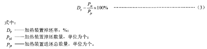 產品在正常工作狀態下運行,試驗時問不小于10min,且截取瓶坯數不小于2500個,按公式(3)計算加熱裝置掉坯率,應符合5.5.3的要求,