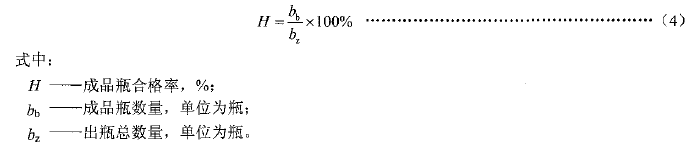 產品在正常工作狀態下運行,試驗時間不小子10min,.且出瓶數不小子500瓶,符合QB/T 1868的非熱定型瓶或符合QB/T2665的熱定型瓶為成品瓶,按公式(4)計算成品瓶合格率,應符合