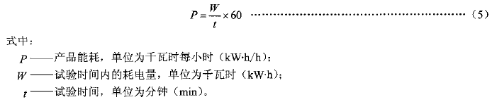 產品在公稱生產能力下運行,試驗時間不小子20 min,用1級精度電度表測量產品(不含附機)耗電量.按公式(5)計算能耗,應符合5.5.6的要求,