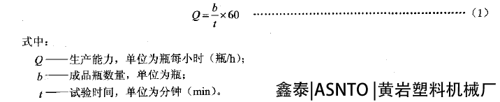 產品在正常工作狀態下運行,試驗時間不小于20min,從輸出第一個成品瓶開始計時,按公式(1) 計算生產能力.應符合S.5.1的要求。