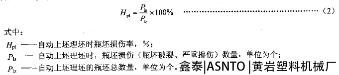 產品在正常工作狀態下運行,試驗時問不小子10mn,且截取瓶坯數不小子2500個,檢驗破裂、嚴重擦傷,對嚴重擦傷有爭議時可根據吹瓶后擦傷是否消失為判斷依據,按公式(2)計算瓶坯傷率, 應符合5.5.2的要求.